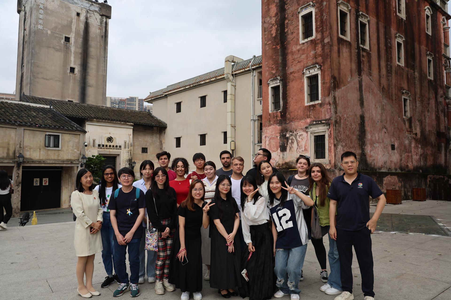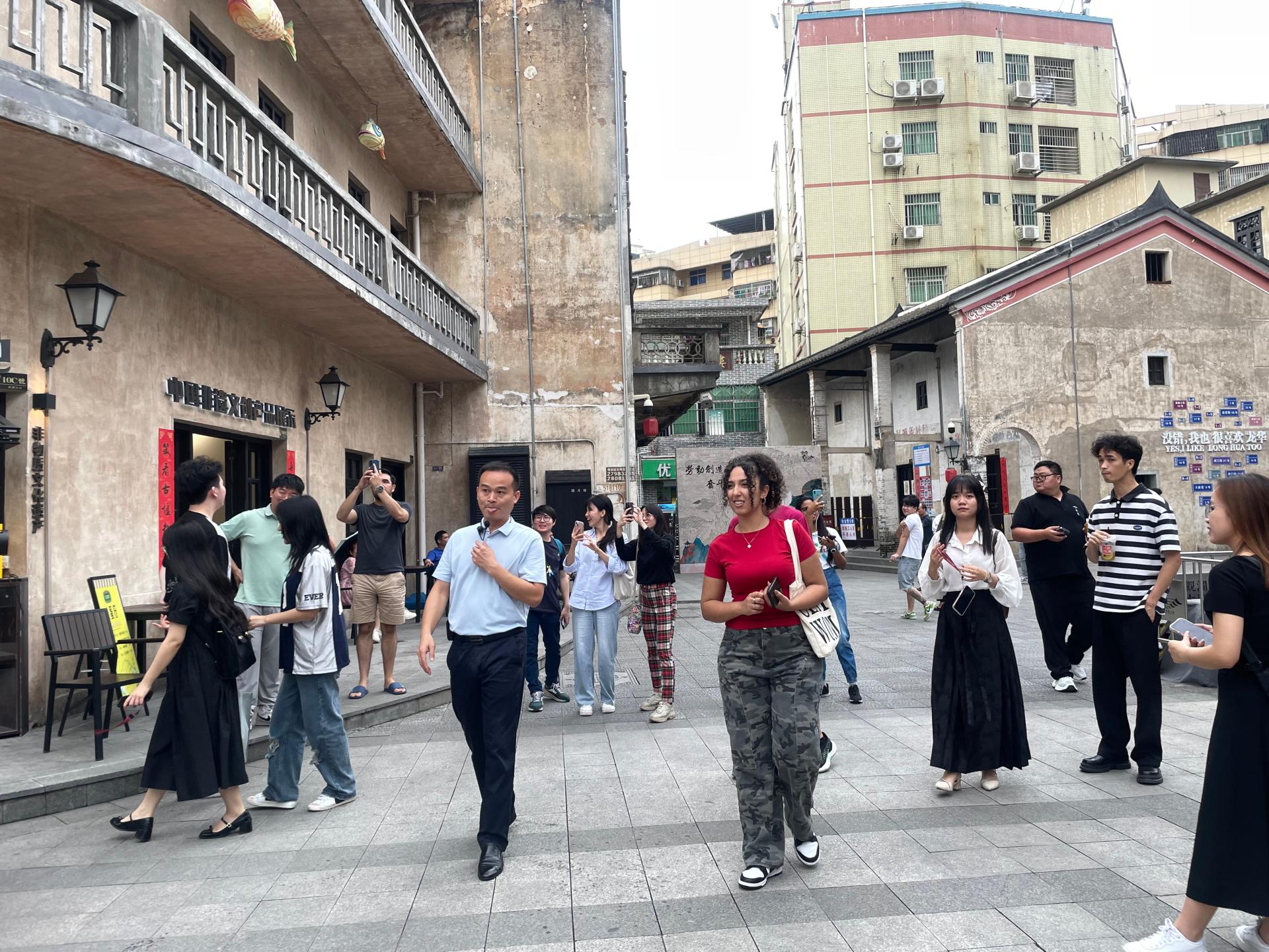 On the afternoon of May 13, 2024, Qin Qing, deputy secretary of the College of International Exchange of Shenzhen University, Liu Wei and Zhang Qianting, Party members and teachers, led 19 students from Australia, Pakistan, South Korea, Malaysia, Morocco, Mexico, Japan, Sri Lanka, Venezuela, Italy, Vietnam and other countries to explore Longhua District. The walking tour started from Longhua Dalang Fashion Town, passed the headquarter of Auratic, the Shenzhen Mei Luen Rosewood Art Museum, and finally ended successfully in Guanlan Culture Town.