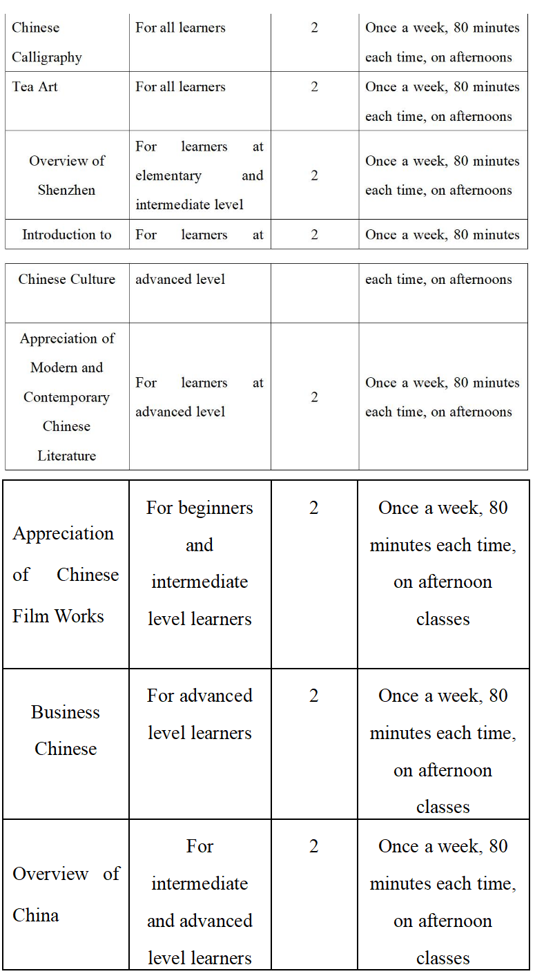 Chinese Communication for Beginners, Chinese Calligraphy, Tea Culture, Chinese Painting,Mandarin Pronunciation, Intensive Training on Chinese Characters, Chinese Corner, Appreciation of Chinese Film Works, Overview of Shenzhen, etc