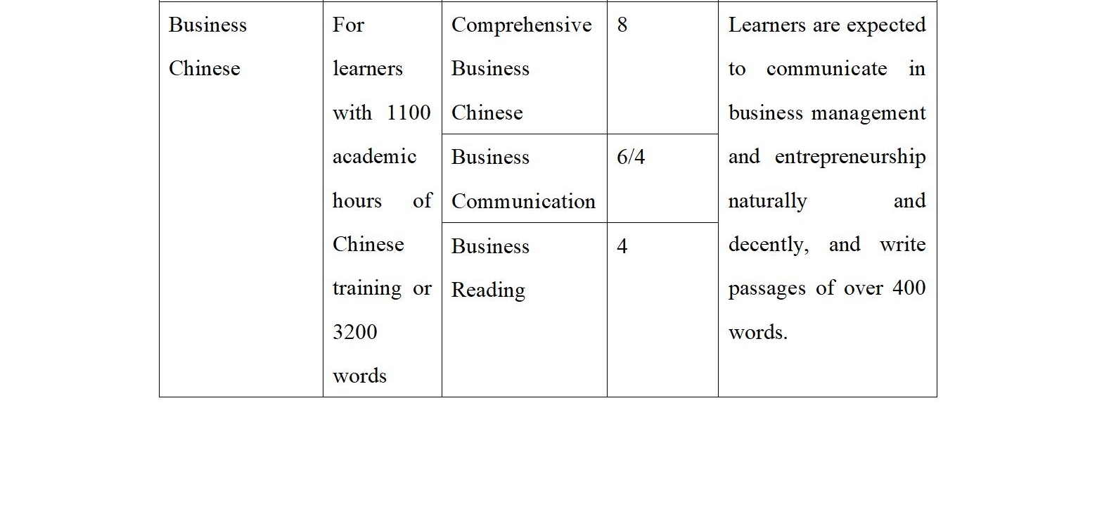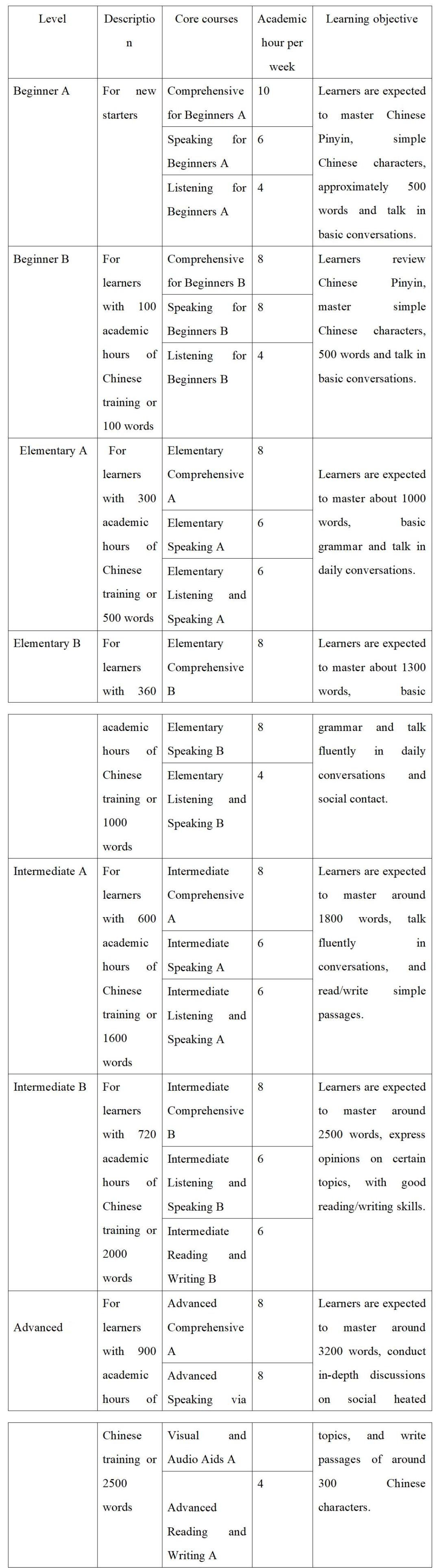 Comprehensive Chinese, Speaking, Reading and Writing, Speaking via Visual and Audio Aids, etc. to be offered based on different levels |