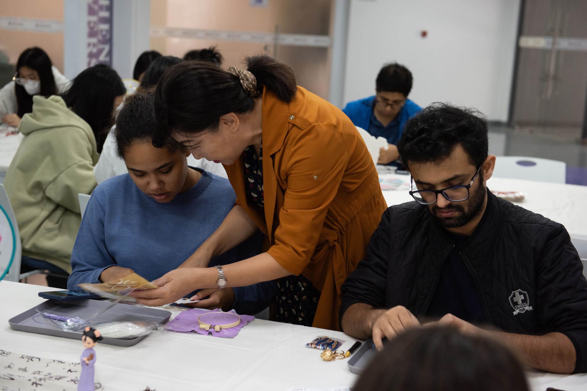 Silk threads crisscross the space, showing the charm of traditional culture. The exhibition of Peace Joy embroidery was lively and laughter continued. The main embroidery teacher introduced the origin and function of the sachet to the international students, and then led the international students to complete the production of the bag. Although it was the first time for the international students to make sachet, the enthusiasm for participation was very high, and soon, a small and exquisite bag was ready. The purse is classical and exquisite, meaning beautiful, looking at the finished purse made by oneself, everyone's face showed a happy smile.