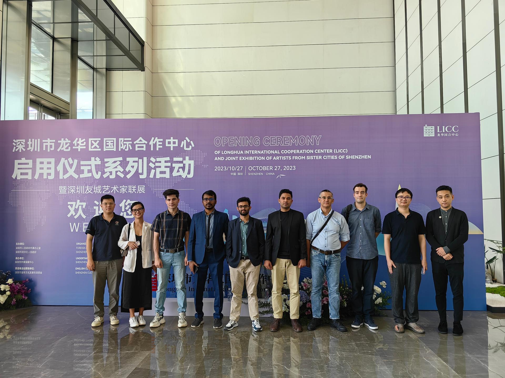 On October 27, 2023, our college was invited to participate in the launching ceremony of the International Cooperation Center and the Shenzhen Sister City Artist Group Exhibition jointly organized by the Foreign Affairs Office of the Shenzhen Municipal People's Government and the Longhua District People's Government of Shenzhen. 2 teachers and 8 international students participated in the event.