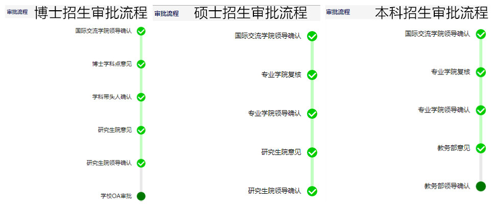 來華留學(xué)招生流程的無紙化審批將國際交流學(xué)院形式審核、培養(yǎng)學(xué)院專業(yè)考核、研究生院/教務(wù)部審批進(jìn)行線上銜接,通過網(wǎng)絡(luò)平臺(tái)開展審批辦公,嚴(yán)格招生審核、過程管理和評(píng)審制度。不僅方便了校內(nèi)相關(guān)單位對(duì)各個(gè)環(huán)節(jié)的了解,同時(shí)也利于處理流程上多環(huán)節(jié)的任務(wù)。