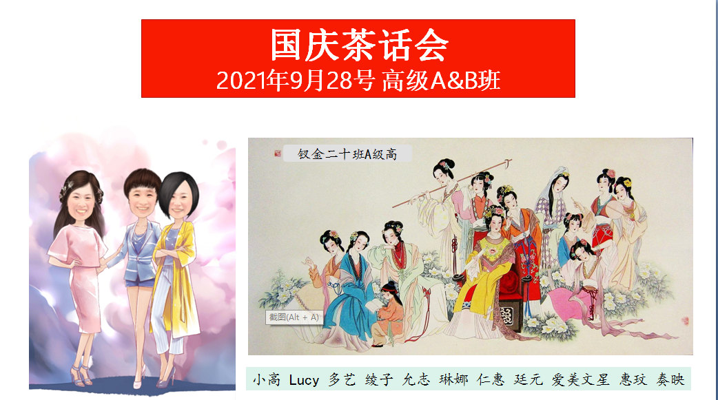 在班長小高和副班長琳娜的精心策劃下,全班的巾幗英雄們(本班沒有須眉)齊協作,共努力,在9月28日上午10點精彩呈現了這場國慶茶話會。