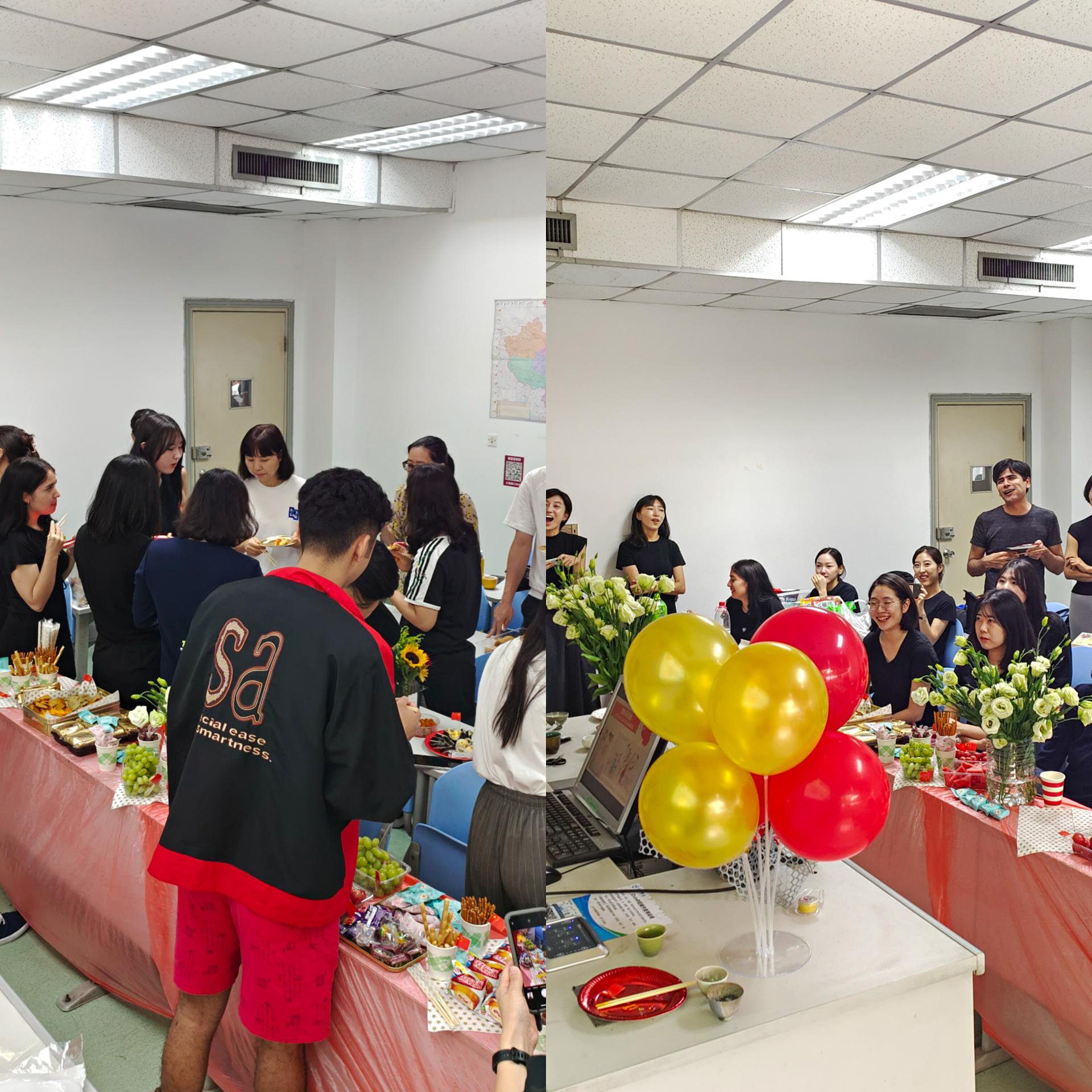 現場氣氛和諧、熱鬧、歡快、有趣。除了吃喝,當然還需要話國慶,班長小高給大家準備了驚喜——五道搶答題,答對了,送你一朵小“紅”花!這幾道題也難倒了在場的老師們,最后,大家在歡聲笑語中,知道了答案,對國慶的知識有了更加深入地了解。這場茶話真是獲益多多,滿足味蕾,提高審美品味,了解傳統文化,增加國慶知識。