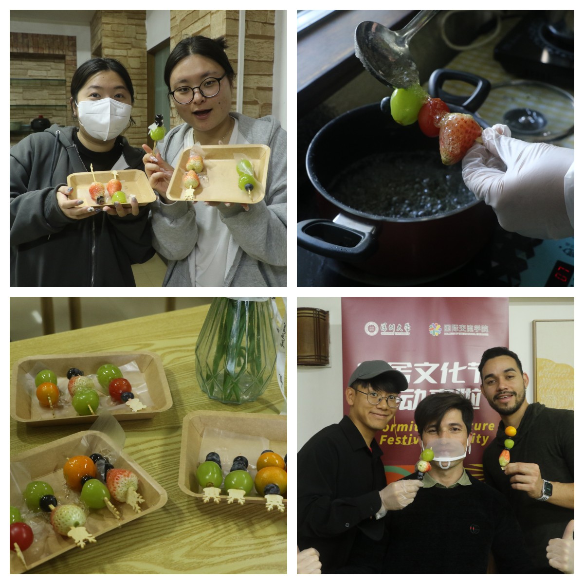 冰糖葫蘆制作的關鍵在于熬糖,但熬糖的工序尤為復雜,劉威老師、熊雄老師和張倩婷老師輪番上陣,控制水和糖的比例、熬湯的時間火候,熬出了一鍋又一鍋的糖漿,也有同學自告奮勇,親自熬制糖漿,為冰糖葫蘆順利制作做好后勤保障。隨后,留學生們紛紛將制作好的水果串掛上糖漿,沒過多久,一串串造型獨特、色彩鮮艷的糖葫蘆就已經初具雛形,大家紛紛拍照留念。活動現場氣氛高漲,大家樂在其中,臉上都洋溢著幸福的笑容。在歡樂的氛圍中,圓滾滾紅彤彤的冰糖水果葫蘆制作完成,為寒冷的冬天添上了一抹嶄新的色彩。