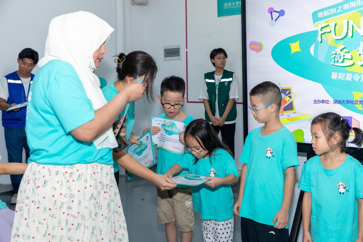 接下來,擔任授課老師的留學生們,依次為每位小朋友頒發了結業證書,并與他們一同送上了精心準備的驚喜禮物。結業證書如同一部時光的紀錄片,它記載著小朋友們參與夏令營的點點滴滴,見證了他們從稚嫩到成熟的每一步成長和變化。它是五天來他們努力學習、不斷探索的最好證明。而那些充滿心意的驚喜禮物,則是對小朋友們五天來堅持與努力的最好肯定與鼓勵,寓意著他們未來的道路將充滿無限可能。
