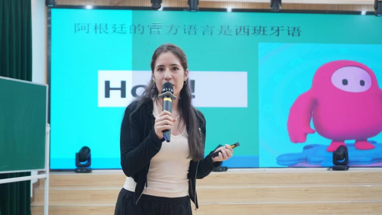 阿根廷留學生路辰霄(BAIGORRIA LUCIA ANDREA),為學校師生帶來了一場精彩紛呈的文化分享盛會。路辰霄運用她流利的中英雙語能力、生動的表達和幽默的講解,為學生們營造了一個輕松愉悅的學習環境。在她的帶領下,學生們仿佛親臨其境,深入了解了阿根廷的主要城市,學習了基礎西班牙語,領略了阿根廷的自然風光、社會生活和美食文化。